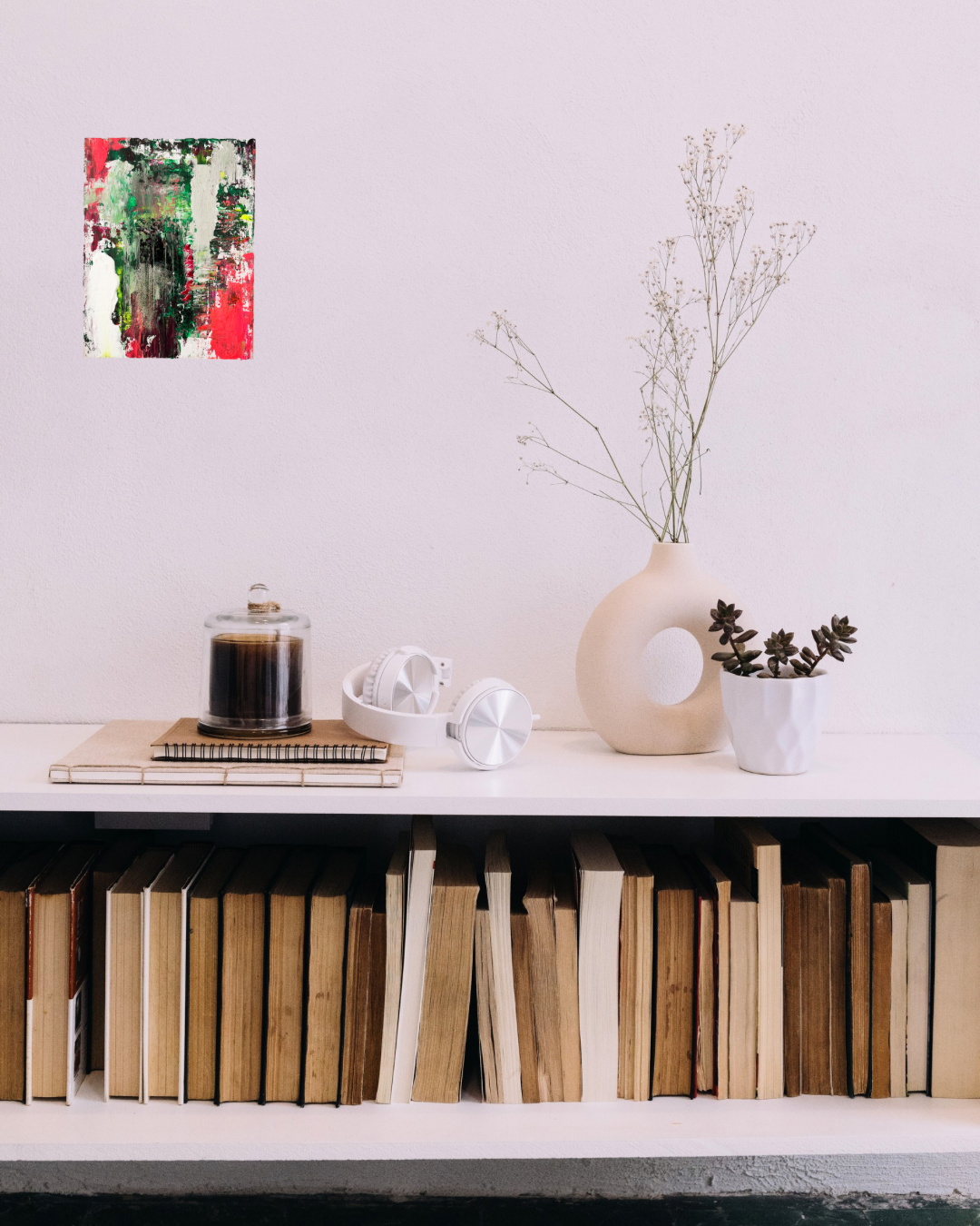 緑と赤の抽象画 0号アクリル画 「動的調和 01」| Abstract Acrylic Painting Green & Red Textured – Dynamic Harmony 01