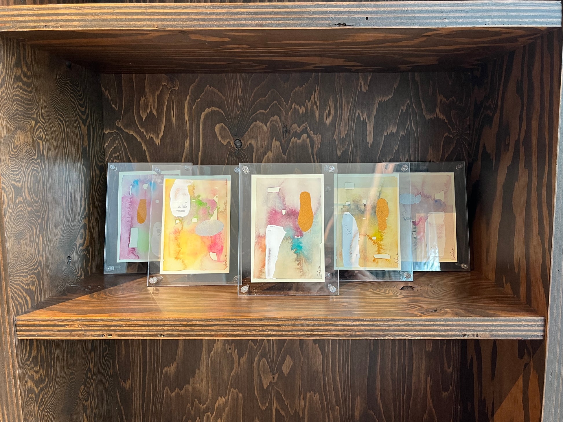 A set of postcard-sized abstract watercolor paintings.