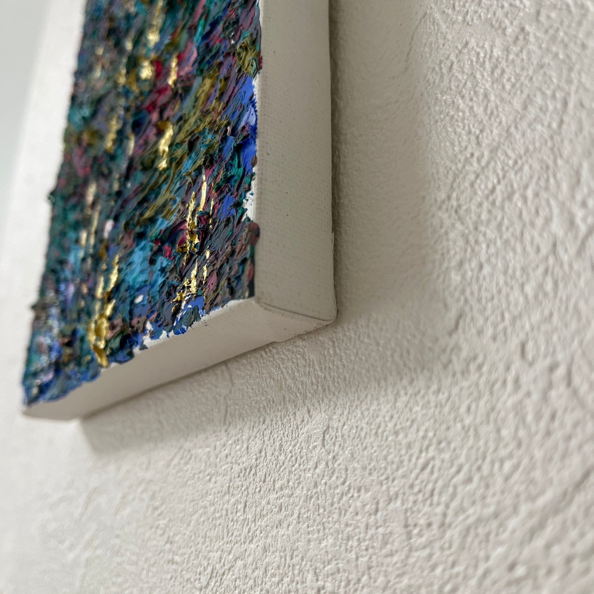 全体的に青い色の作品ですが、複数の色を差し色にして乗せています。